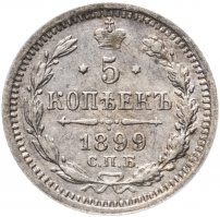 В центре указан номинал «5», ограниченный с обеих сторон звездочками. Над цифрой – Корона Российской империи. Под цифрой номинала — слово "КОПЕЕК". Ниже, расположен декоративный разделитель в виде двух разнонаправленных фигурных линий и стилизованным из точек крестом между ними. Под разделителем — дата выпуска монеты «1899». Под цифрой даты — обозначение монетного двора «С.П.Б.». Вдоль канта, не доходя до короны, изображен венок из лавровой и дубовой ветви, которые в нижней части перевязаны лентой на узел бантом. По окружности канта имеются рельефные элементы, выполненные в виде зубцов.