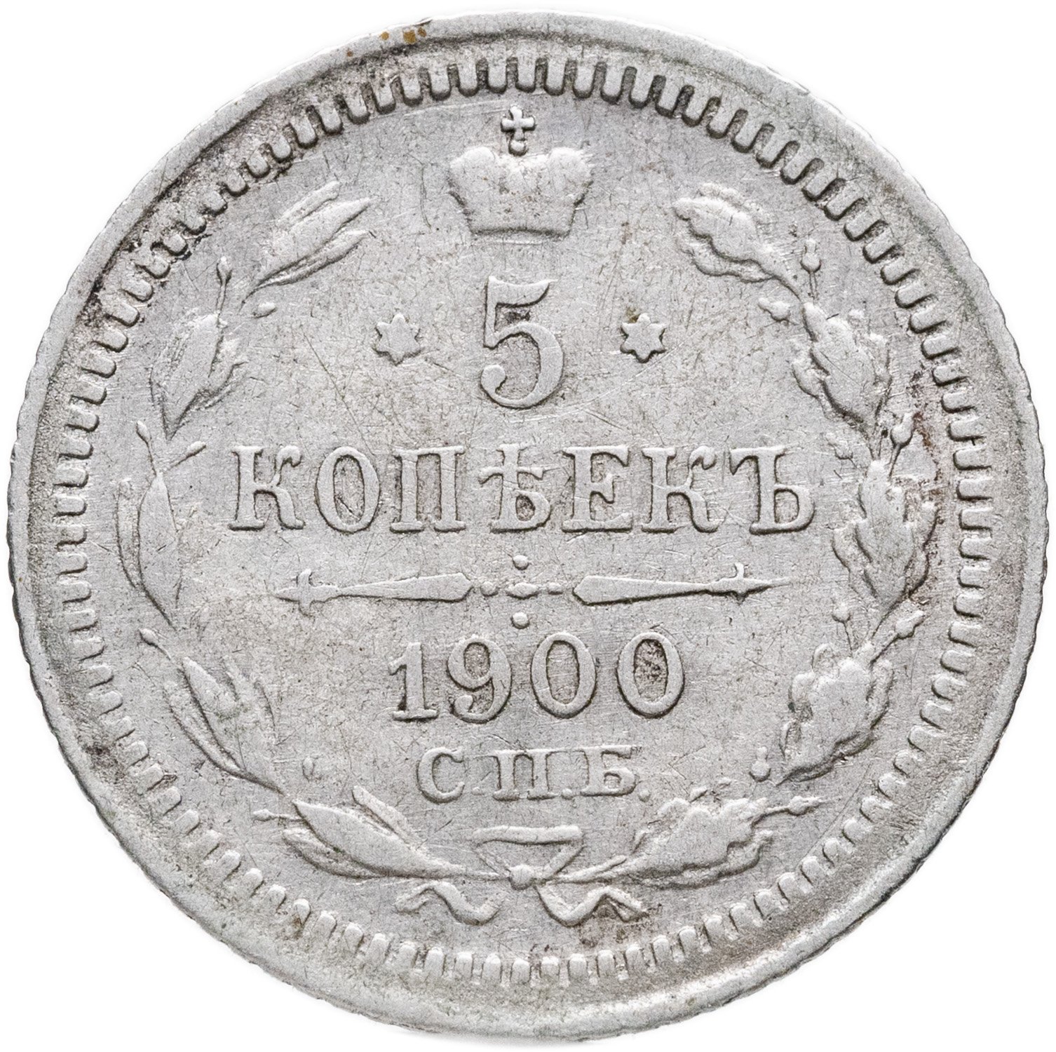 В центре указан номинал «5», ограниченный с обеих сторон звездочками. Над цифрой – Корона Российской империи. Под цифрой номинала — слово "КОПЕЕК". Ниже, расположен декоративный разделитель в виде двух разнонаправленных фигурных линий и стилизованным из точек крестом между ними. Под разделителем — дата выпуска монеты «1900». Под цифрой даты — обозначение монетного двора «С.П.Б.». Вдоль канта, не доходя до короны, изображен венок из лавровой и дубовой ветви, которые в нижней части перевязаны лентой на узел бантом. По окружности канта имеются рельефные элементы, выполненные в виде зубцов.