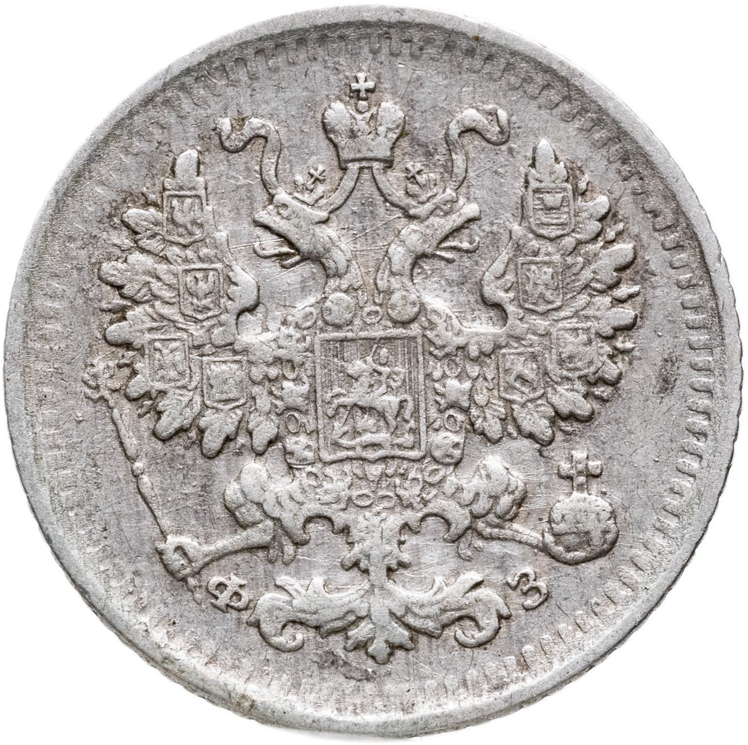 В центре изображен Малый Государственный Герб Российской империи - двуглавый орёл, головы которого увенчаны двумя коронами, третья, большая корона над ними. Все они соединены орденской лентой ордена Св. Апостола Андрея Первозванного. На груди орла расположен Московский герб, в щите изображен Георгий Победоносец с копьем поражающий дракона. Вокруг щита цепь ордена Св. Апостола Андрея Первозванного. На крыльях изображены гербы: Царства Казанского, Польского, Херсонеса Таврического, Астраханского, Сибирского, Грузинского и герб соединенных княжеств Киевского, Новгородского и Владимирского — по 4 на каждое крыло. В правой лапе орла – скипетр, в левой – держава. Под правой лапой – буква «Ф», под левой – буква «З». Инициалы минцмейстера Феликса Залемана. По окружности канта имеются рельефные элементы, выполненные в виде зубцов.