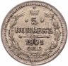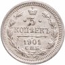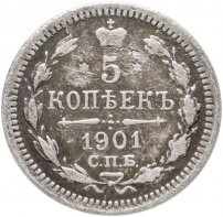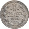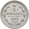В центре указан номинал «5», ограниченный с обеих сторон звездочками. Над цифрой – Корона Российской империи. Под цифрой номинала — слово "КОПЕЕК". Ниже, расположен декоративный разделитель в виде двух разнонаправленных фигурных линий и стилизованным из точек крестом между ними. Под разделителем — дата выпуска монеты «1901». Под цифрой даты — обозначение монетного двора «С.П.Б.». Вдоль канта, не доходя до короны, изображен венок из лавровой и дубовой ветви, которые в нижней части перевязаны лентой на узел бантом. По окружности канта имеются рельефные элементы, выполненные в виде зубцов.