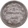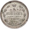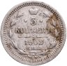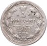 В центре указан номинал «5», ограниченный с обеих сторон звездочками. Над цифрой – Корона Российской империи. Под цифрой номинала — слово "КОПЕЕК". Ниже, расположен декоративный разделитель в виде двух разнонаправленных фигурных линий и стилизованным из точек крестом между ними. Под разделителем — дата выпуска монеты «1902». Под цифрой даты — обозначение монетного двора «С.П.Б.». Вдоль канта, не доходя до короны, изображен венок из лавровой и дубовой ветви, которые в нижней части перевязаны лентой на узел бантом. По окружности канта имеются рельефные элементы, выполненные в виде зубцов.