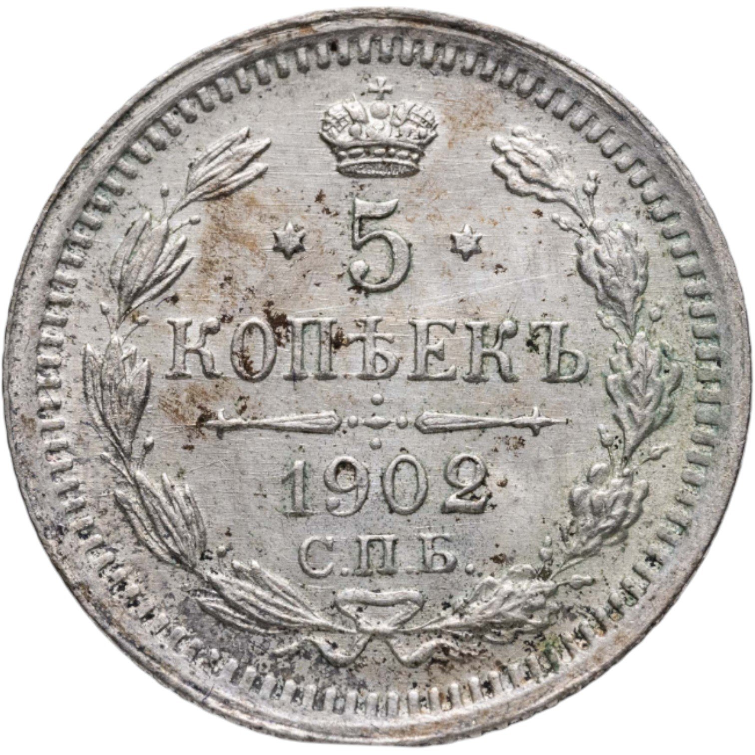 В центре указан номинал «5», ограниченный с обеих сторон звездочками. Над цифрой – Корона Российской империи. Под цифрой номинала — слово "КОПЕЕК". Ниже, расположен декоративный разделитель в виде двух разнонаправленных фигурных линий и стилизованным из точек крестом между ними. Под разделителем — дата выпуска монеты «1902». Под цифрой даты — обозначение монетного двора «С.П.Б.». Вдоль канта, не доходя до короны, изображен венок из лавровой и дубовой ветви, которые в нижней части перевязаны лентой на узел бантом. По окружности канта имеются рельефные элементы, выполненные в виде зубцов.