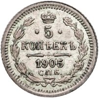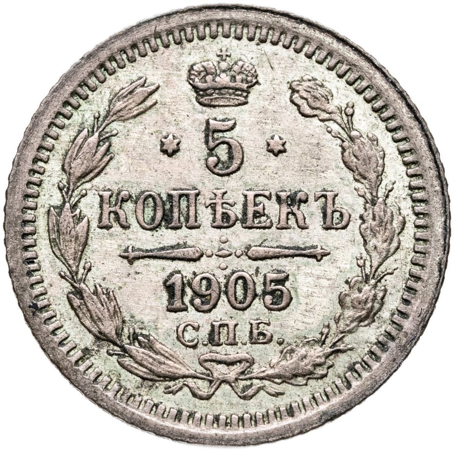 В центре указан номинал «5», ограниченный с обеих сторон звездочками. Над цифрой – Корона Российской империи. Под цифрой номинала — слово "КОПЕЕК". Ниже, расположен декоративный разделитель в виде двух разнонаправленных фигурных линий и стилизованным из точек крестом между ними. Под разделителем — дата выпуска монеты «1905». Под цифрой даты — обозначение монетного двора «С.П.Б.». Вдоль канта, не доходя до короны, изображен венок из лавровой и дубовой ветви, которые в нижней части перевязаны лентой на узел бантом. По окружности канта имеются рельефные элементы, выполненные в виде зубцов.