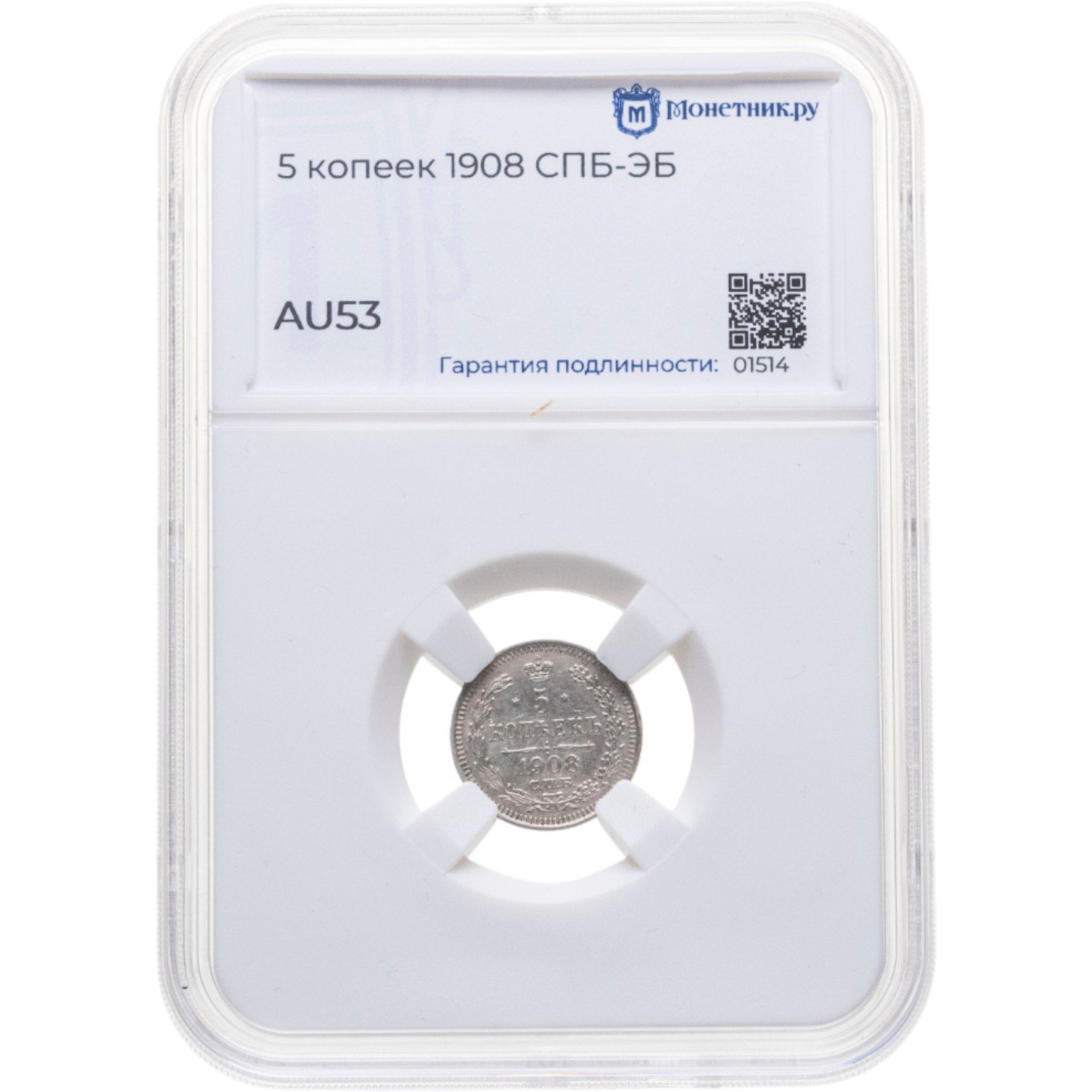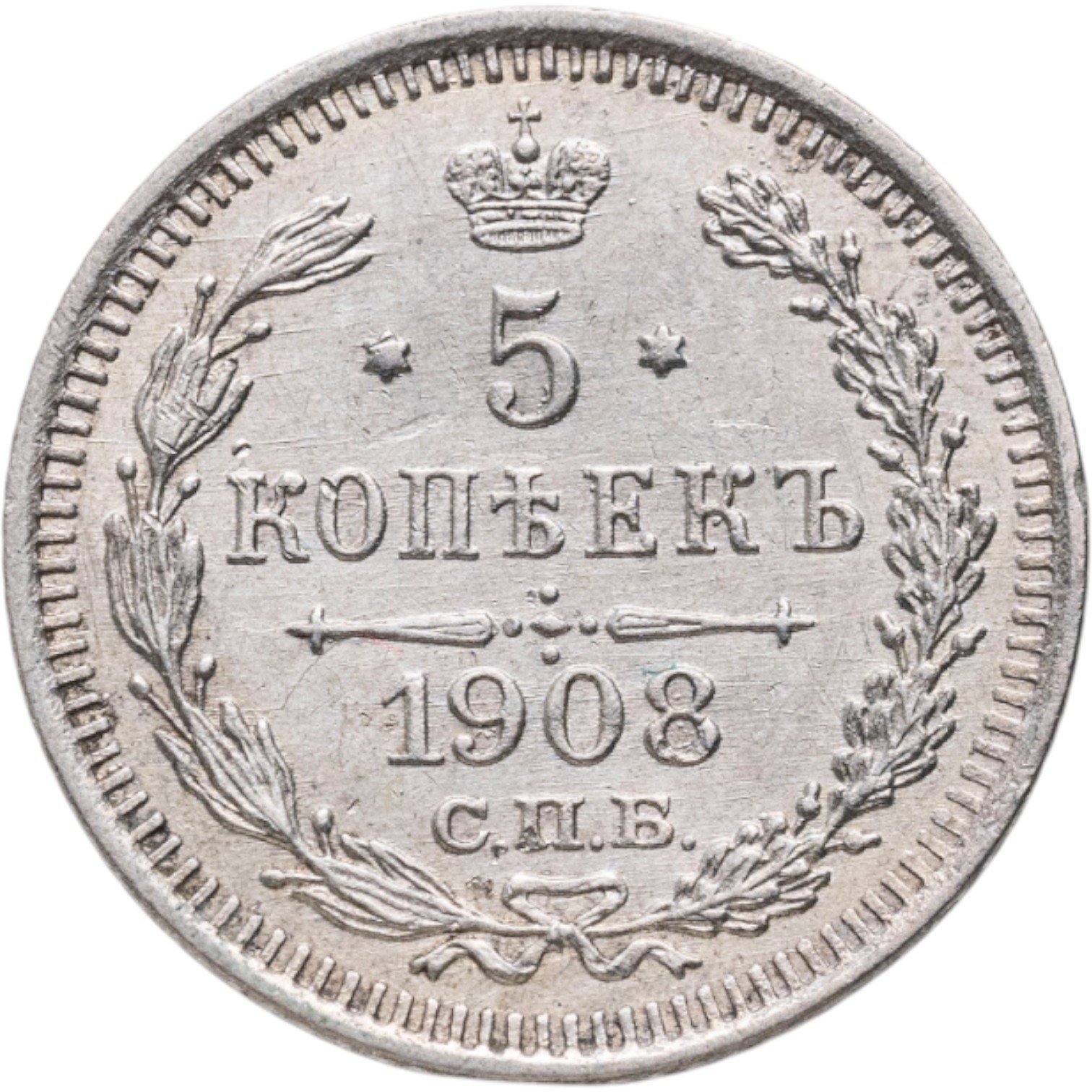 В центре указан номинал «5», ограниченный с обеих сторон звездочками. Над цифрой – Корона Российской империи. Под цифрой номинала — слово "КОПЕЕК". Ниже, расположен декоративный разделитель в виде двух разнонаправленных фигурных линий и стилизованным из точек крестом между ними. Под разделителем — дата выпуска монеты «1908». Под цифрой даты — обозначение монетного двора «С.П.Б.». Вдоль канта, не доходя до короны, изображен венок из лавровой и дубовой ветви, которые в нижней части перевязаны лентой на узел бантом. По окружности канта имеются рельефные элементы, выполненные в виде зубцов.