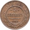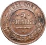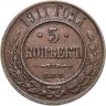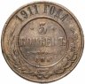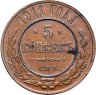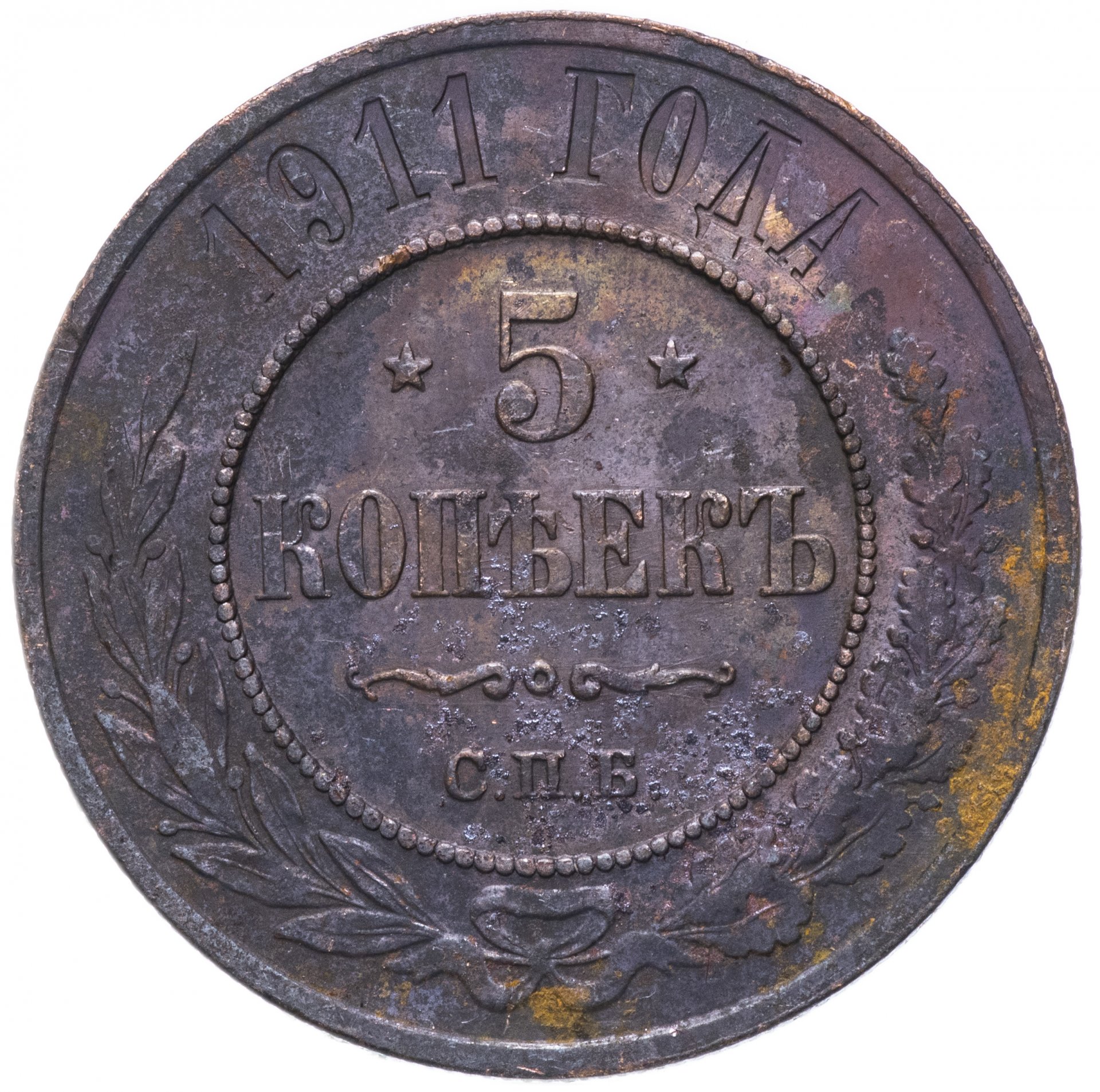 В центре указан номинал — цифра «5», ограниченная с обеих сторон звездочками. Под цифрой номинала — слово "КОПЕЕК". Ниже, расположен декоративный разделитель в виде двух изогнутых линий и небольшой окружности между ними. Под разделителем — обозначение монетного двора «С.П.Б.». Центральная часть отделена от остального изображения, окружностью в виде точек. В верхней части полукругом углубленная надпись: "1911 ГОДА". Вдоль канта изображен венок из лавровой и дубовой ветвей, которые, в нижней части, перевязаны лентой на узел бантом.