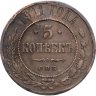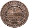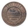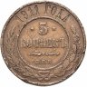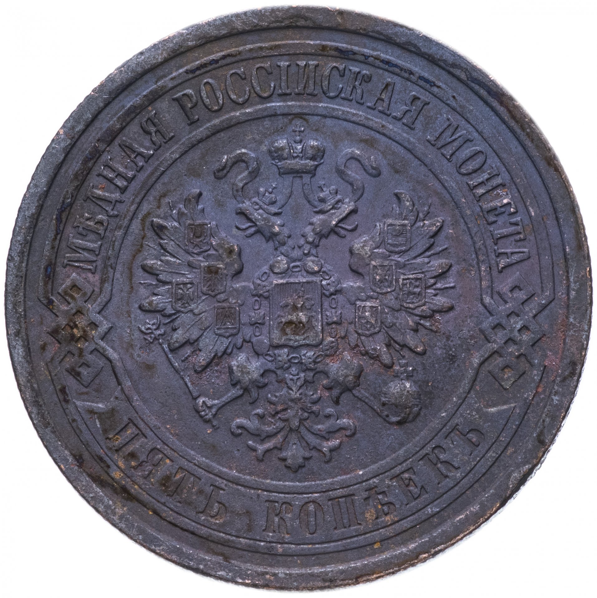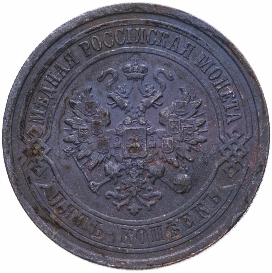 В центре монеты изображен Малый Государственный Герб Российской империи - двуглавый орел, головы которого увенчаны двумя коронами, третья, большая корона над ними. Все они соединены лентой Андрея Первозванного. В правой лапе орла – скипетр, в левой – держава. На его груди расположен Московский герб, в щите изображен Георгий Победоносец с копьем поражающий дракона. Вокруг щита цепь ордена Св. Апостола Андрея Первозванного. На крыльях орла изображены гербы: Царства Казанского, Польского, Херсонеса Таврического, Астраханского, Сибирского, Грузинского и герб соединенных княжеств Киевского, Новгородского и Владимирского — по 4 на каждое крыло. По окружности - две полукруглые плашки, соединенные узорами. На верхней плашке выпуклая надпись: "МЕДНАЯ РОССИЙСКАЯ МОНЕТА". На нижней плашке, изображенной в виде ленты, углубленная надпись: "ПЯТЬ КОПЕЕК".