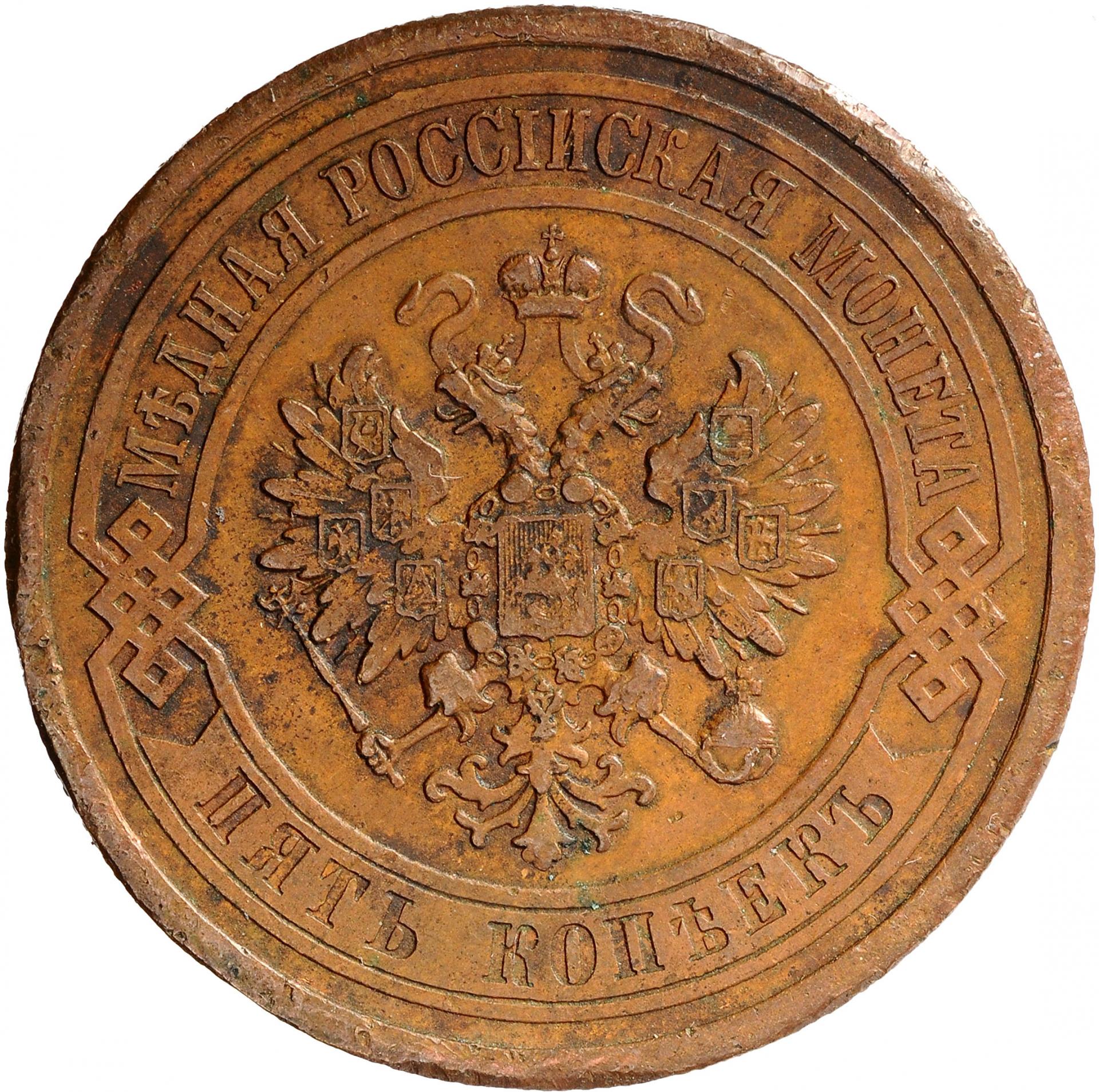 В центре монеты изображен Малый Государственный Герб Российской империи - двуглавый орел, головы которого увенчаны двумя коронами, третья, большая корона над ними. Все они соединены лентой Андрея Первозванного. В правой лапе орла – скипетр, в левой – держава. На его груди расположен Московский герб, в щите изображен Георгий Победоносец с копьем поражающий дракона. Вокруг щита цепь ордена Св. Апостола Андрея Первозванного. На крыльях орла изображены гербы: Царства Казанского, Польского, Херсонеса Таврического, Астраханского, Сибирского, Грузинского и герб соединенных княжеств Киевского, Новгородского и Владимирского — по 4 на каждое крыло. По окружности - две полукруглые плашки, соединенные узорами. На верхней плашке выпуклая надпись: "МЕДНАЯ РОССИЙСКАЯ МОНЕТА". На нижней плашке, изображенной в виде ленты, углубленная надпись: "ПЯТЬ КОПЕЕК".