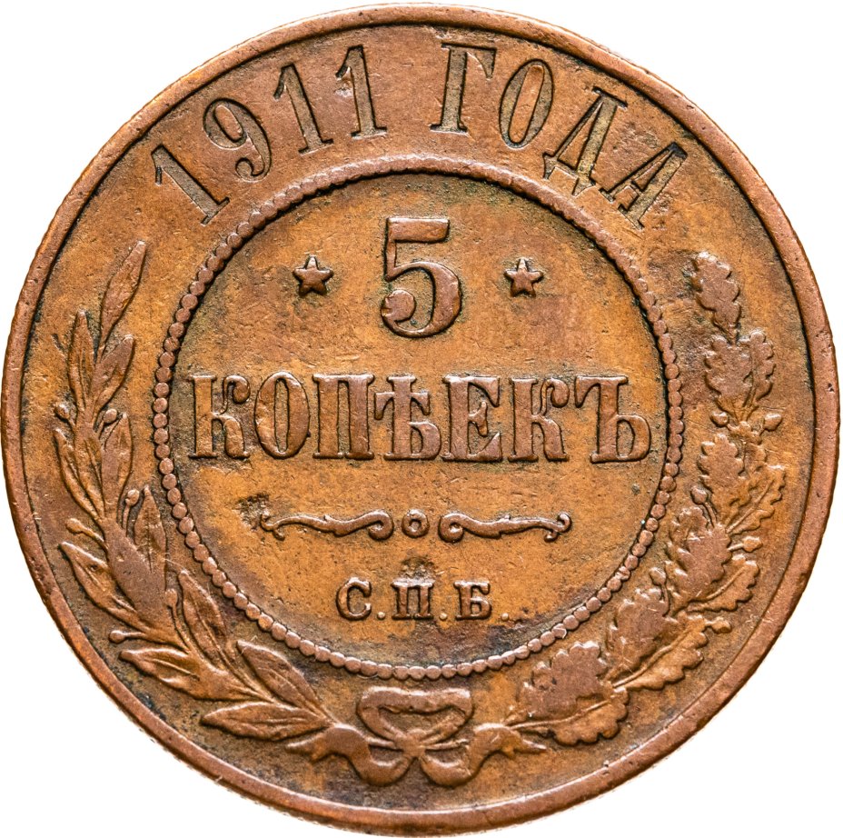 В центре указан номинал — цифра «5», ограниченная с обеих сторон звездочками. Под цифрой номинала — слово "КОПЕЕК". Ниже, расположен декоративный разделитель в виде двух изогнутых линий и небольшой окружности между ними. Под разделителем — обозначение монетного двора «С.П.Б.». Центральная часть отделена от остального изображения, окружностью в виде точек. В верхней части полукругом углубленная надпись: "1911 ГОДА". Вдоль канта изображен венок из лавровой и дубовой ветвей, которые, в нижней части, перевязаны лентой на узел бантом.