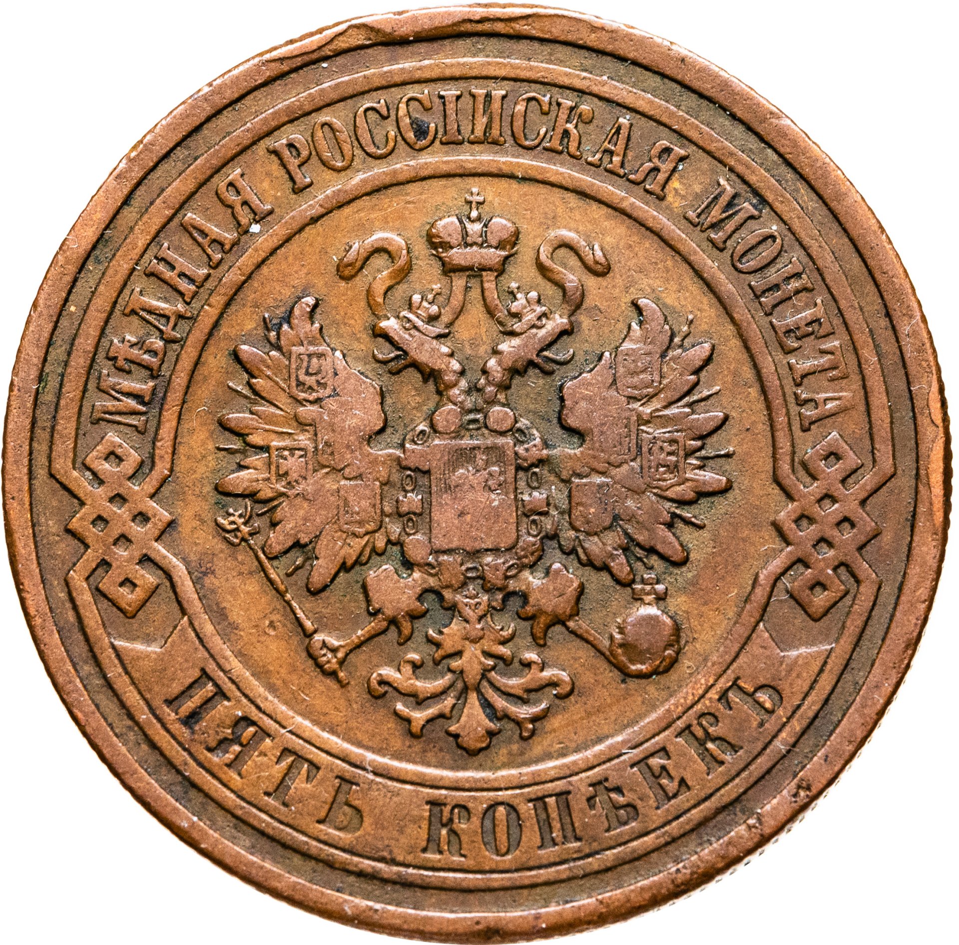 В центре монеты изображен Малый Государственный Герб Российской империи - двуглавый орел, головы которого увенчаны двумя коронами, третья, большая корона над ними. Все они соединены лентой Андрея Первозванного. В правой лапе орла – скипетр, в левой – держава. На его груди расположен Московский герб, в щите изображен Георгий Победоносец с копьем поражающий дракона. Вокруг щита цепь ордена Св. Апостола Андрея Первозванного. На крыльях орла изображены гербы: Царства Казанского, Польского, Херсонеса Таврического, Астраханского, Сибирского, Грузинского и герб соединенных княжеств Киевского, Новгородского и Владимирского — по 4 на каждое крыло. По окружности - две полукруглые плашки, соединенные узорами. На верхней плашке выпуклая надпись: "МЕДНАЯ РОССИЙСКАЯ МОНЕТА". На нижней плашке, изображенной в виде ленты, углубленная надпись: "ПЯТЬ КОПЕЕК".