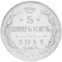В центре указан номинал «5», ограниченный с обеих сторон звездочками. Над цифрой – Корона Российской империи. Под цифрой номинала — слово "КОПЕЕК". Ниже, расположен декоративный разделитель в виде двух разнонаправленных фигурных линий и стилизованным из точек крестом между ними. Под разделителем — дата выпуска монеты «1911». Под цифрой даты — обозначение монетного двора «С.П.Б.». Вдоль канта, не доходя до короны, изображен венок из лавровой и дубовой ветви, которые в нижней части перевязаны лентой на узел бантом. По окружности канта имеются рельефные элементы, выполненные в виде зубцов.