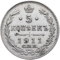 В центре указан номинал «5», ограниченный с обеих сторон звездочками. Над цифрой – Корона Российской империи. Под цифрой номинала — слово "КОПЕЕК". Ниже, расположен декоративный разделитель в виде двух разнонаправленных фигурных линий и стилизованным из точек крестом между ними. Под разделителем — дата выпуска монеты «1911». Под цифрой даты — обозначение монетного двора «С.П.Б.». Вдоль канта, не доходя до короны, изображен венок из лавровой и дубовой ветви, которые в нижней части перевязаны лентой на узел бантом. По окружности канта имеются рельефные элементы, выполненные в виде зубцов.