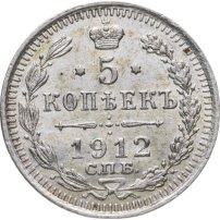 В центре указан номинал «5», ограниченный с обеих сторон звездочками. Над цифрой – Корона Российской империи. Под цифрой номинала — слово "КОПЕЕК". Ниже, расположен декоративный разделитель в виде двух разнонаправленных фигурных линий и стилизованным из точек крестом между ними. Под разделителем — дата выпуска монеты «1912». Под цифрой даты — обозначение монетного двора «С.П.Б.». Вдоль канта, не доходя до короны, изображен венок из лавровой и дубовой ветви, которые в нижней части перевязаны лентой на узел бантом. По окружности канта имеются рельефные элементы, выполненные в виде зубцов.