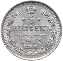 В центре указан номинал «5», ограниченный с обеих сторон звездочками. Над цифрой – Корона Российской империи. Под цифрой номинала — слово "КОПЕЕК". Ниже, расположен декоративный разделитель в виде двух разнонаправленных фигурных линий и стилизованным из точек крестом между ними. Под разделителем — дата выпуска монеты «1913». Под цифрой даты — обозначение монетного двора «С.П.Б.». Вдоль канта, не доходя до короны, изображен венок из лавровой и дубовой ветви, которые в нижней части
