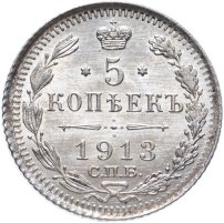 В центре указан номинал «5», ограниченный с обеих сторон звездочками. Над цифрой – Корона Российской империи. Под цифрой номинала — слово "КОПЕЕК". Ниже, расположен декоративный разделитель в виде двух разнонаправленных фигурных линий и стилизованным из точек крестом между ними. Под разделителем — дата выпуска монеты «1913». Под цифрой даты — обозначение монетного двора «С.П.Б.». Вдоль канта, не доходя до короны, изображен венок из лавровой и дубовой ветви, которые в нижней части