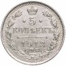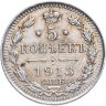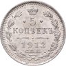 В центре указан номинал «5», ограниченный с обеих сторон звездочками. Над цифрой – Корона Российской империи. Под цифрой номинала — слово "КОПЕЕК". Ниже, расположен декоративный разделитель в виде двух разнонаправленных фигурных линий и стилизованным из точек крестом между ними. Под разделителем — дата выпуска монеты «1913». Под цифрой даты — обозначение монетного двора «С.П.Б.». Вдоль канта, не доходя до короны, изображен венок из лавровой и дубовой ветви, которые в нижней части