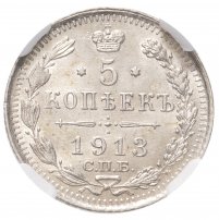 Купить 5 копеек 1913 СПБ-ВС в слабе ННР MS64