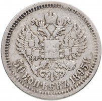 В центре изображен Малый Государственный Герб Российской империи - двуглавый орёл, головы которого увенчаны двумя коронами, третья, большая корона над ними. Все они соединены орденской лентой ордена Св. Апостола Андрея Первозванного. На груди орла расположен Московский герб, в щите изображен Георгий Победоносец с копьем поражающий дракона. Вокруг щита цепь ордена Св. Апостола Андрея Первозванного. На крыльях изображены гербы: Царства Казанского, Польского, Херсонеса Таврического, Астраханского, Сибирского, Грузинского и герб соединенных княжеств Киевского, Новгородского и Владимирского — по 4 на каждое крыло. В правой лапе орла – скипетр, в левой – держава. Под ним слева направо изображены: номинал - надпись «50 копеек» и дата выпуска «1895 Г.». По окружности канта имеются рельефные элементы, выполненные в виде зубцов.