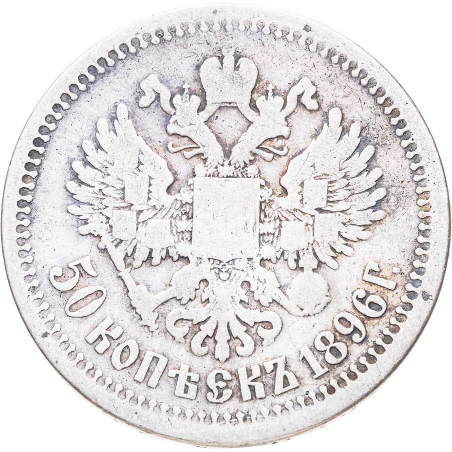 В центре изображен Малый Государственный Герб Российской империи - двуглавый орёл, головы которого увенчаны двумя коронами, третья, большая корона над ними. Все они соединены орденской лентой ордена Св. Апостола Андрея Первозванного. На груди орла расположен Московский герб, в щите изображен Георгий Победоносец с копьем поражающий дракона. Вокруг щита цепь ордена Св. Апостола Андрея Первозванного. На крыльях изображены гербы: Царства Казанского, Польского, Херсонеса Таврического, Астраханского, Сибирского, Грузинского и герб соединенных княжеств Киевского, Новгородского и Владимирского — по 4 на каждое крыло. В правой лапе орла – скипетр, в левой – держава. Под ним слева направо изображены: номинал - надпись «50 копеек» и дата выпуска «1896 Г.». По окружности канта имеются рельефные элементы, выполненные в виде зубцов.