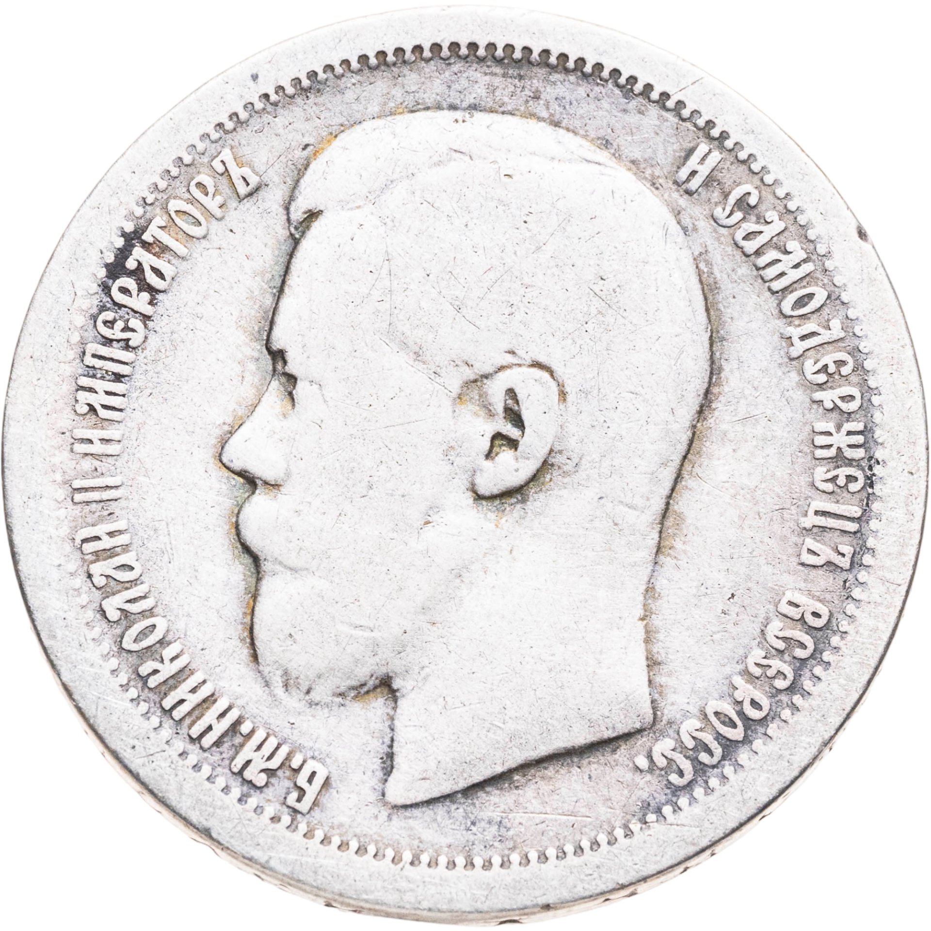 В центре профильный портрет влево императора Николая II. Слева надпись «Б.М. НИКОЛАЙ II ИМПЕРАТОР», справа - «И САМОДЕРЖЕЦ ВСЕРОСС.». По окружности канта имеются рельефные элементы, выполненные в виде зубцов.
