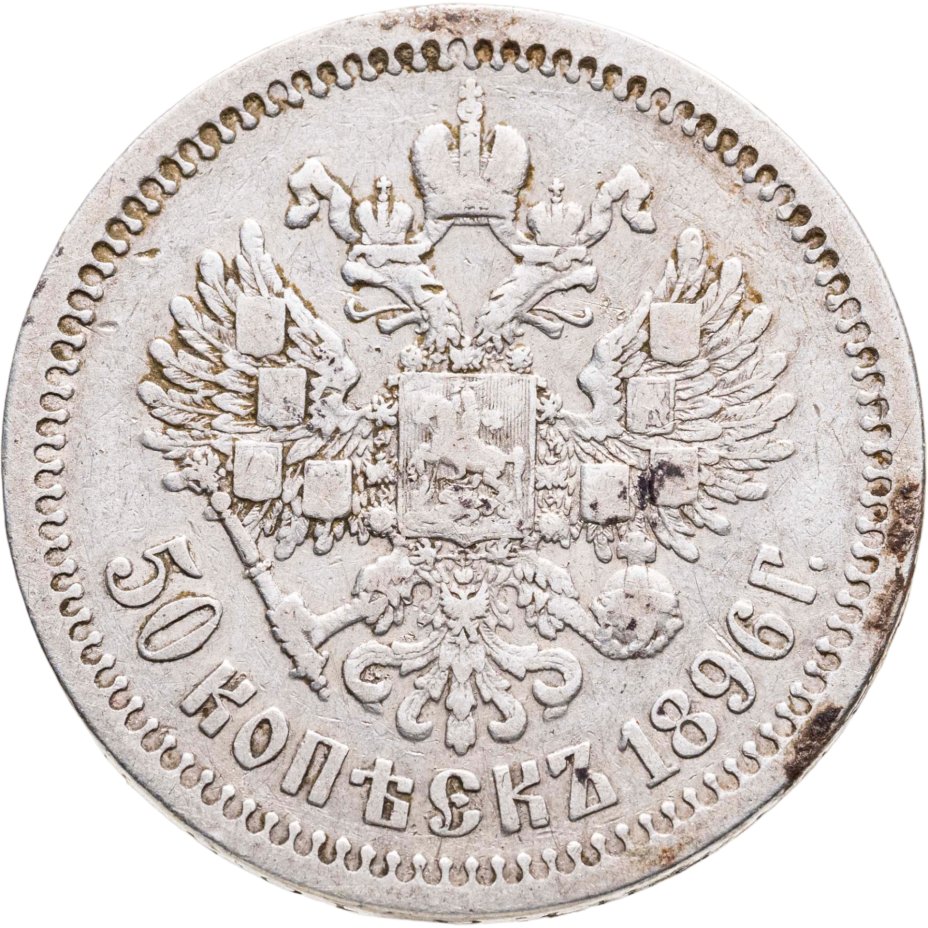 В центре изображен Малый Государственный Герб Российской империи - двуглавый орёл, головы которого увенчаны двумя коронами, третья, большая корона над ними. Все они соединены орденской лентой ордена Св. Апостола Андрея Первозванного. На груди орла расположен Московский герб, в щите изображен Георгий Победоносец с копьем поражающий дракона. Вокруг щита цепь ордена Св. Апостола Андрея Первозванного. На крыльях изображены гербы: Царства Казанского, Польского, Херсонеса Таврического, Астраханского, Сибирского, Грузинского и герб соединенных княжеств Киевского, Новгородского и Владимирского — по 4 на каждое крыло. В правой лапе орла – скипетр, в левой – держава. Под ним слева направо изображены: номинал - надпись «50 копеек» и дата выпуска «1896 Г.». По окружности канта имеются рельефные элементы, выполненные в виде зубцов.