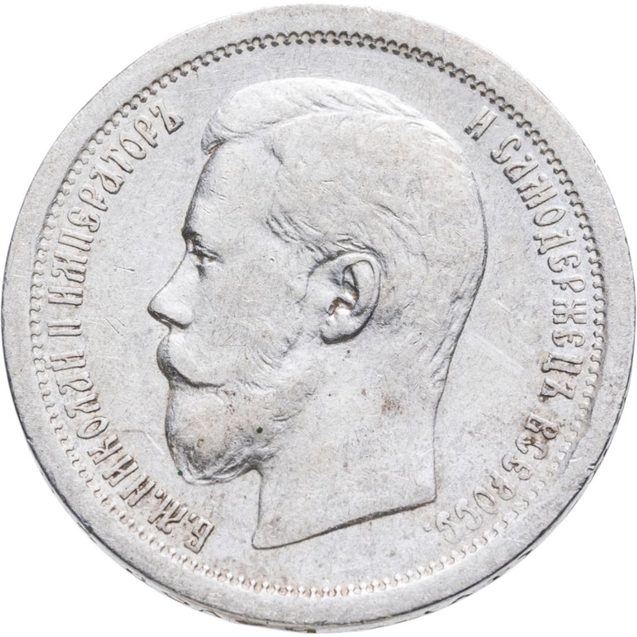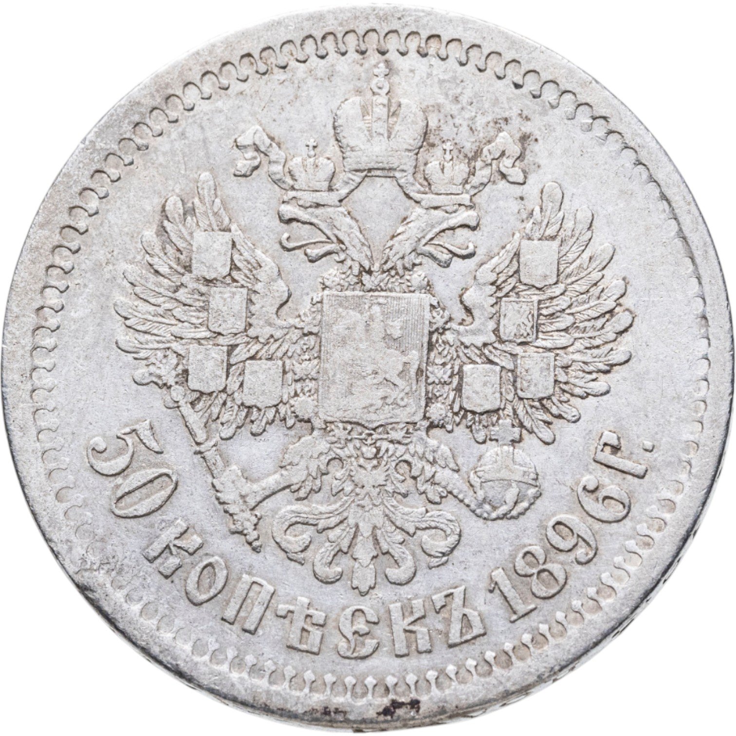 В центре изображен Малый Государственный Герб Российской империи - двуглавый орёл, головы которого увенчаны двумя коронами, третья, большая корона над ними. Все они соединены орденской лентой ордена Св. Апостола Андрея Первозванного. На груди орла расположен Московский герб, в щите изображен Георгий Победоносец с копьем поражающий дракона. Вокруг щита цепь ордена Св. Апостола Андрея Первозванного. На крыльях изображены гербы: Царства Казанского, Польского, Херсонеса Таврического, Астраханского, Сибирского, Грузинского и герб соединенных княжеств Киевского, Новгородского и Владимирского — по 4 на каждое крыло. В правой лапе орла – скипетр, в левой – держава. Под ним слева направо изображены: номинал - надпись «50 копеек» и дата выпуска «1896 Г.». По окружности канта имеются рельефные элементы, выполненные в виде зубцов.