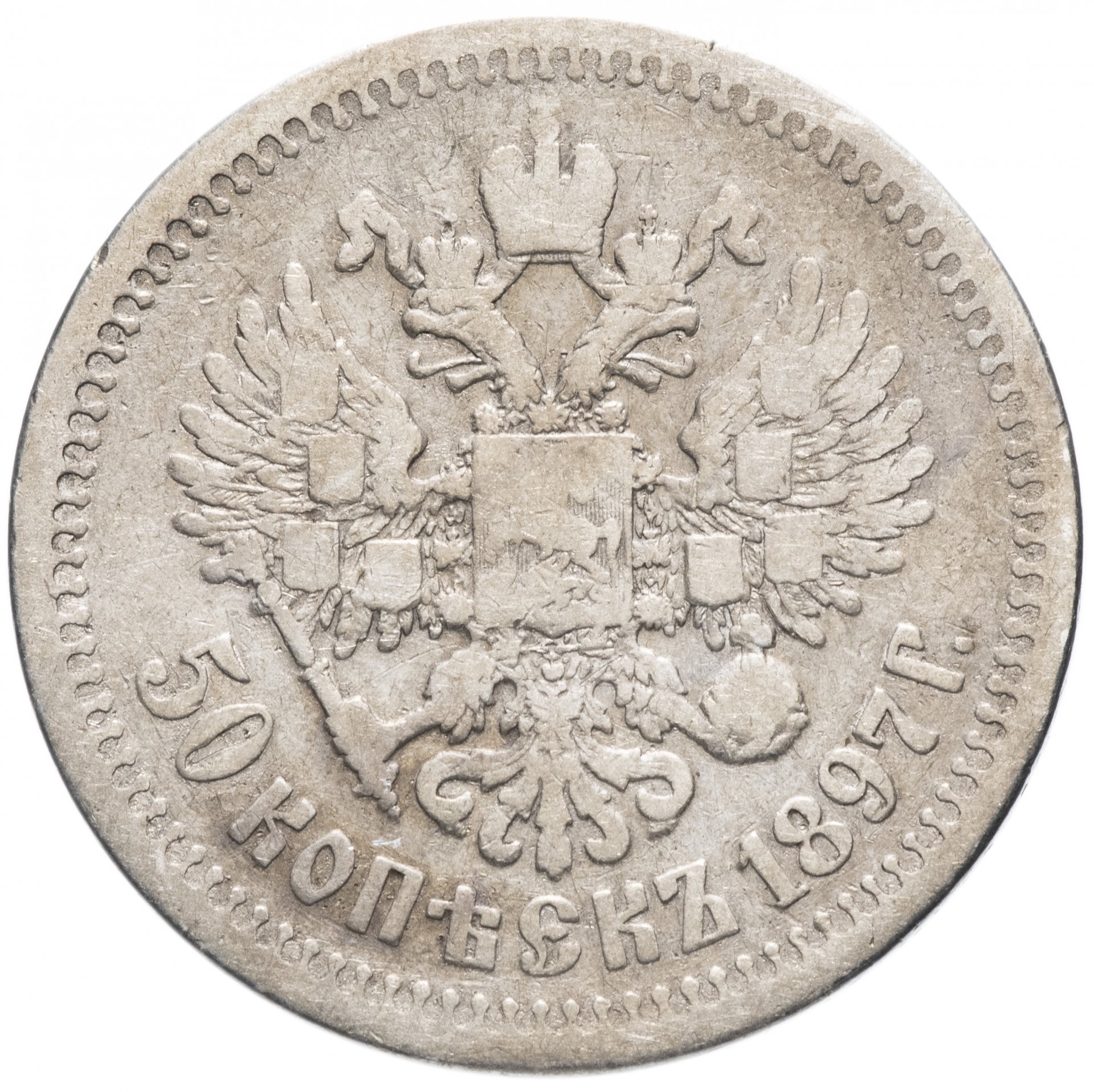 В центре изображен Малый Государственный Герб Российской империи - двуглавый орёл, головы которого увенчаны двумя коронами, третья, большая корона над ними. Все они соединены орденской лентой ордена Св. Апостола Андрея Первозванного. На груди орла расположен Московский герб, в щите изображен Георгий Победоносец с копьем поражающий дракона. Вокруг щита цепь ордена Св. Апостола Андрея Первозванного. На крыльях изображены гербы: Царства Казанского, Польского, Херсонеса Таврического, Астраханского, Сибирского, Грузинского и герб соединенных княжеств Киевского, Новгородского и Владимирского — по 4 на каждое крыло. В правой лапе орла – скипетр, в левой – держава. Под ним слева направо изображены: номинал - надпись «50 копеек» и дата выпуска «1897 Г.». По окружности канта имеются рельефные элементы, выполненные в виде зубцов.