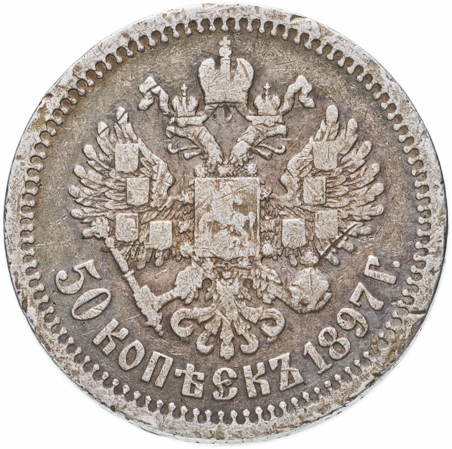 В центре изображен Малый Государственный Герб Российской империи - двуглавый орёл, головы которого увенчаны двумя коронами, третья, большая корона над ними. Все они соединены орденской лентой ордена Св. Апостола Андрея Первозванного. На груди орла расположен Московский герб, в щите изображен Георгий Победоносец с копьем поражающий дракона. Вокруг щита цепь ордена Св. Апостола Андрея Первозванного. На крыльях изображены гербы: Царства Казанского, Польского, Херсонеса Таврического, Астраханского, Сибирского, Грузинского и герб соединенных княжеств Киевского, Новгородского и Владимирского — по 4 на каждое крыло. В правой лапе орла – скипетр, в левой – держава. Под ним слева направо изображены: номинал - надпись «50 копеек» и дата выпуска «1897 Г.». По окружности канта имеются рельефные элементы, выполненные в виде зубцов.