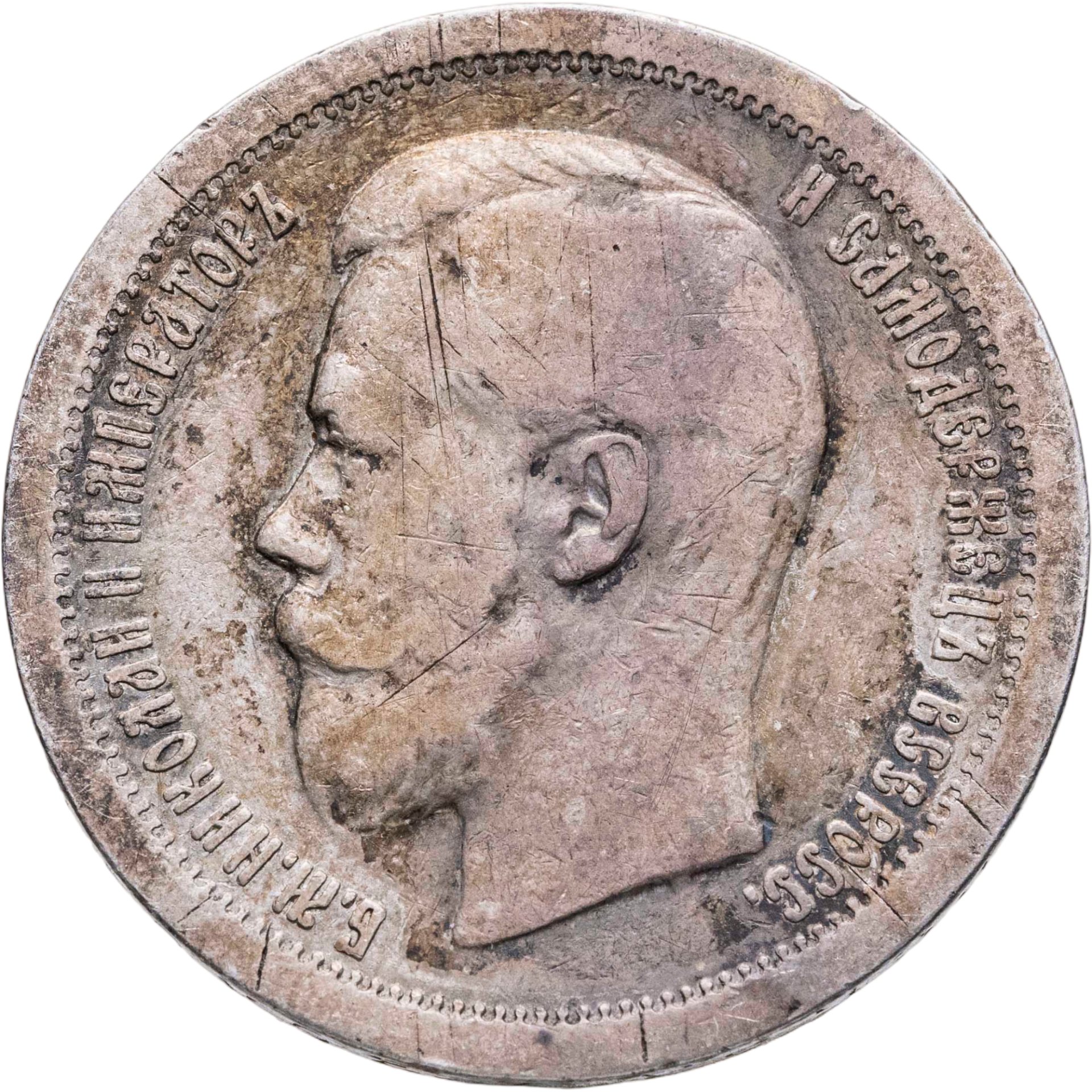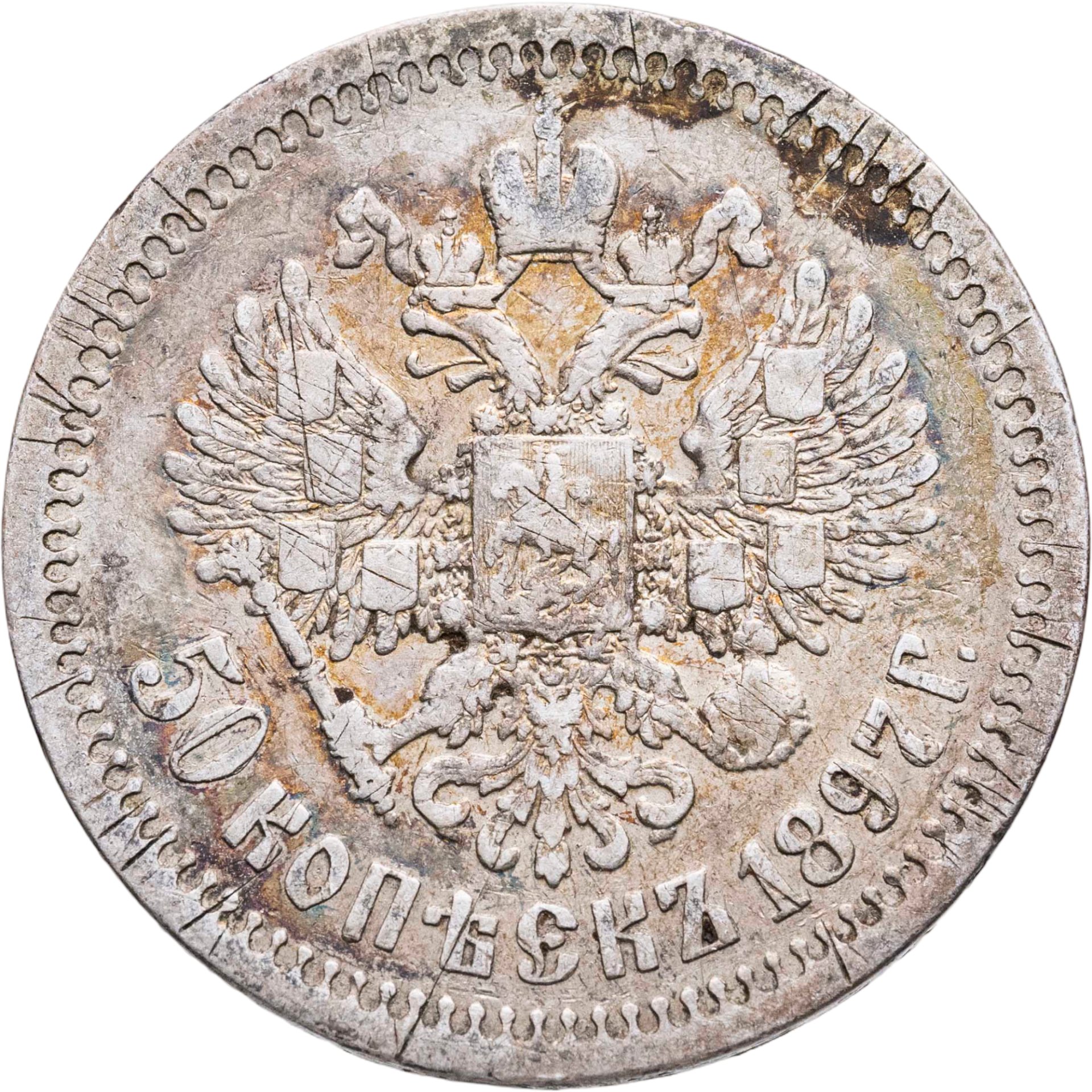В центре изображен Малый Государственный Герб Российской империи - двуглавый орёл, головы которого увенчаны двумя коронами, третья, большая корона над ними. Все они соединены орденской лентой ордена Св. Апостола Андрея Первозванного. На груди орла расположен Московский герб, в щите изображен Георгий Победоносец с копьем поражающий дракона. Вокруг щита цепь ордена Св. Апостола Андрея Первозванного. На крыльях изображены гербы: Царства Казанского, Польского, Херсонеса Таврического, Астраханского, Сибирского, Грузинского и герб соединенных княжеств Киевского, Новгородского и Владимирского — по 4 на каждое крыло. В правой лапе орла – скипетр, в левой – держава. Под ним слева направо изображены: номинал - надпись «50 копеек» и дата выпуска «1897 Г.». По окружности канта имеются рельефные элементы, выполненные в виде зубцов.