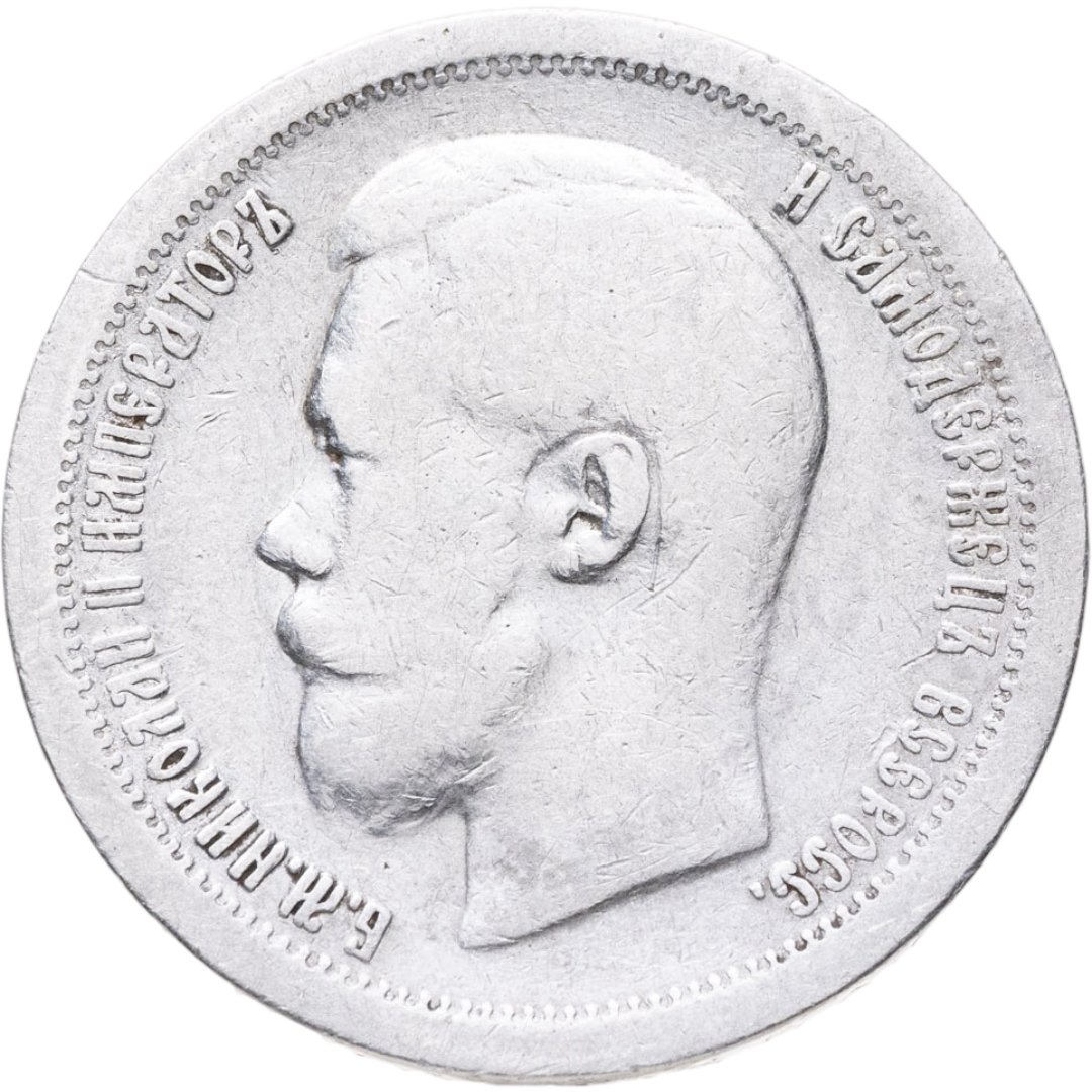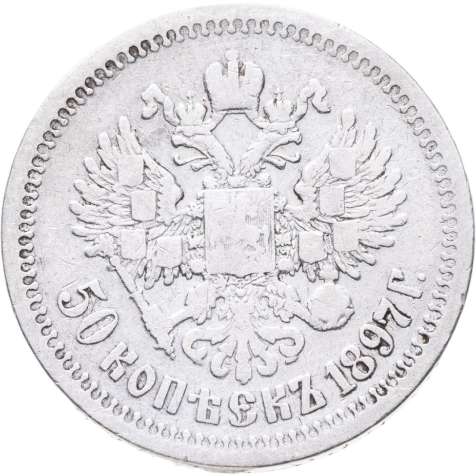 В центре изображен Малый Государственный Герб Российской империи - двуглавый орёл, головы которого увенчаны двумя коронами, третья, большая корона над ними. Все они соединены орденской лентой ордена Св. Апостола Андрея Первозванного. На груди орла расположен Московский герб, в щите изображен Георгий Победоносец с копьем поражающий дракона. Вокруг щита цепь ордена Св. Апостола Андрея Первозванного. На крыльях изображены гербы: Царства Казанского, Польского, Херсонеса Таврического, Астраханского, Сибирского, Грузинского и герб соединенных княжеств Киевского, Новгородского и Владимирского — по 4 на каждое крыло. В правой лапе орла – скипетр, в левой – держава. Под ним слева направо изображены: номинал - надпись «50 копеек» и дата выпуска «1897 Г.». По окружности канта имеются рельефные элементы, выполненные в виде зубцов.