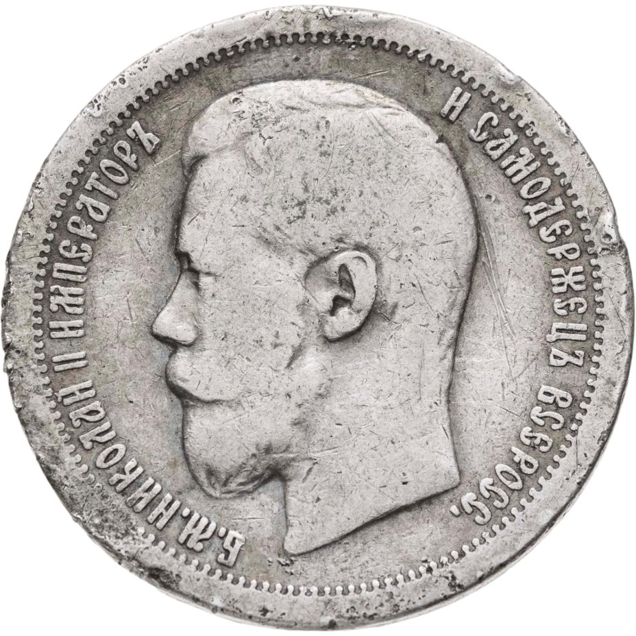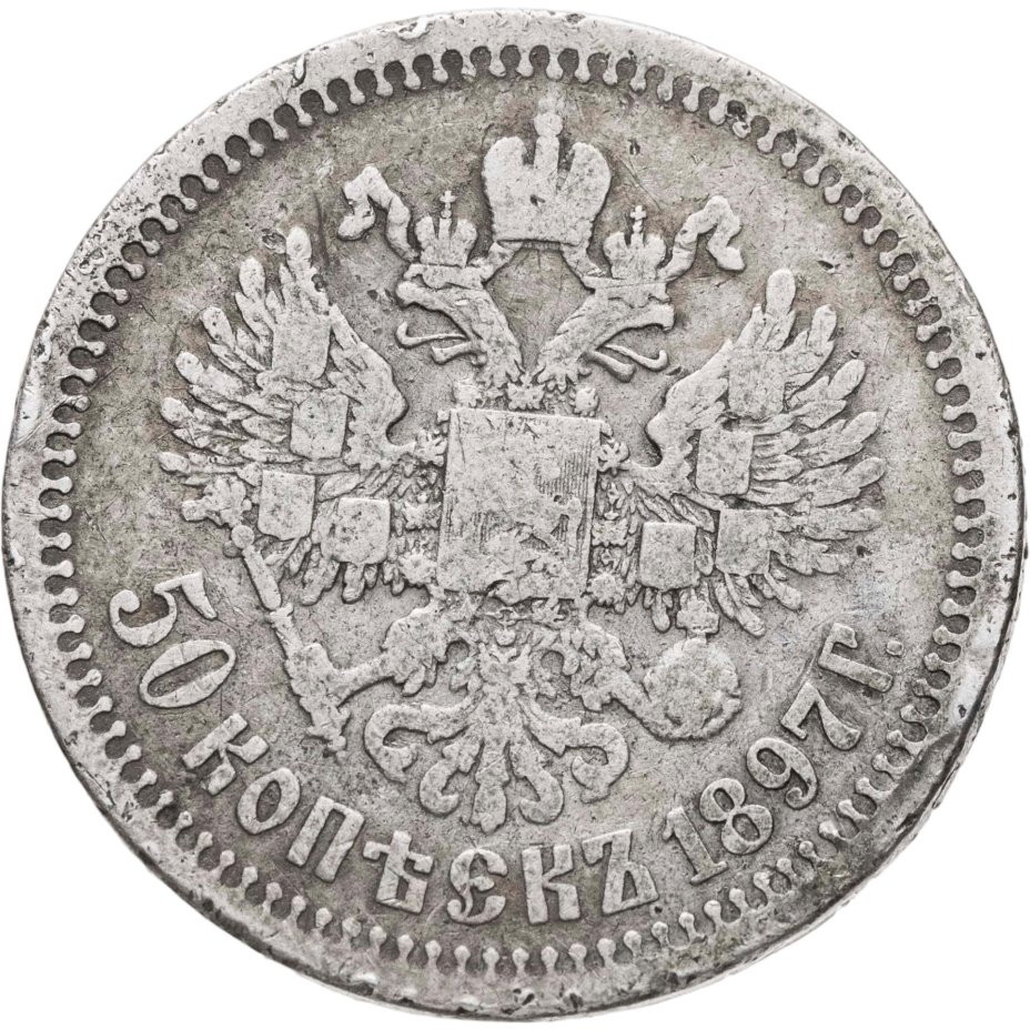 В центре изображен Малый Государственный Герб Российской империи - двуглавый орёл, головы которого увенчаны двумя коронами, третья, большая корона над ними. Все они соединены орденской лентой ордена Св. Апостола Андрея Первозванного. На груди орла расположен Московский герб, в щите изображен Георгий Победоносец с копьем поражающий дракона. Вокруг щита цепь ордена Св. Апостола Андрея Первозванного. На крыльях изображены гербы: Царства Казанского, Польского, Херсонеса Таврического, Астраханского, Сибирского, Грузинского и герб соединенных княжеств Киевского, Новгородского и Владимирского — по 4 на каждое крыло. В правой лапе орла – скипетр, в левой – держава. Под ним слева направо изображены: номинал - надпись «50 копеек» и дата выпуска «1897 Г.». По окружности канта имеются рельефные элементы, выполненные в виде зубцов.