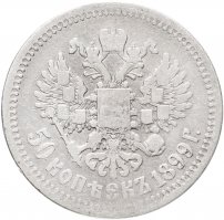 В центре изображен Малый Государственный Герб Российской империи - двуглавый орёл, головы которого увенчаны двумя коронами, третья, большая корона над ними. Все они соединены орденской лентой ордена Св. Апостола Андрея Первозванного. На груди орла расположен Московский герб, в щите изображен Георгий Победоносец с копьем поражающий дракона. Вокруг щита цепь ордена Св. Апостола Андрея Первозванного. На крыльях изображены гербы: Царства Казанского, Польского, Херсонеса Таврического, Астраханского, Сибирского, Грузинского и герб соединенных княжеств Киевского, Новгородского и Владимирского — по 4 на каждое крыло. В правой лапе орла – скипетр, в левой – держава. Под ним слева направо изображены: номинал - надпись «50 копеек» и дата выпуска «1899 Г.». По окружности канта имеются рельефные элементы, выполненные в виде зубцов.
