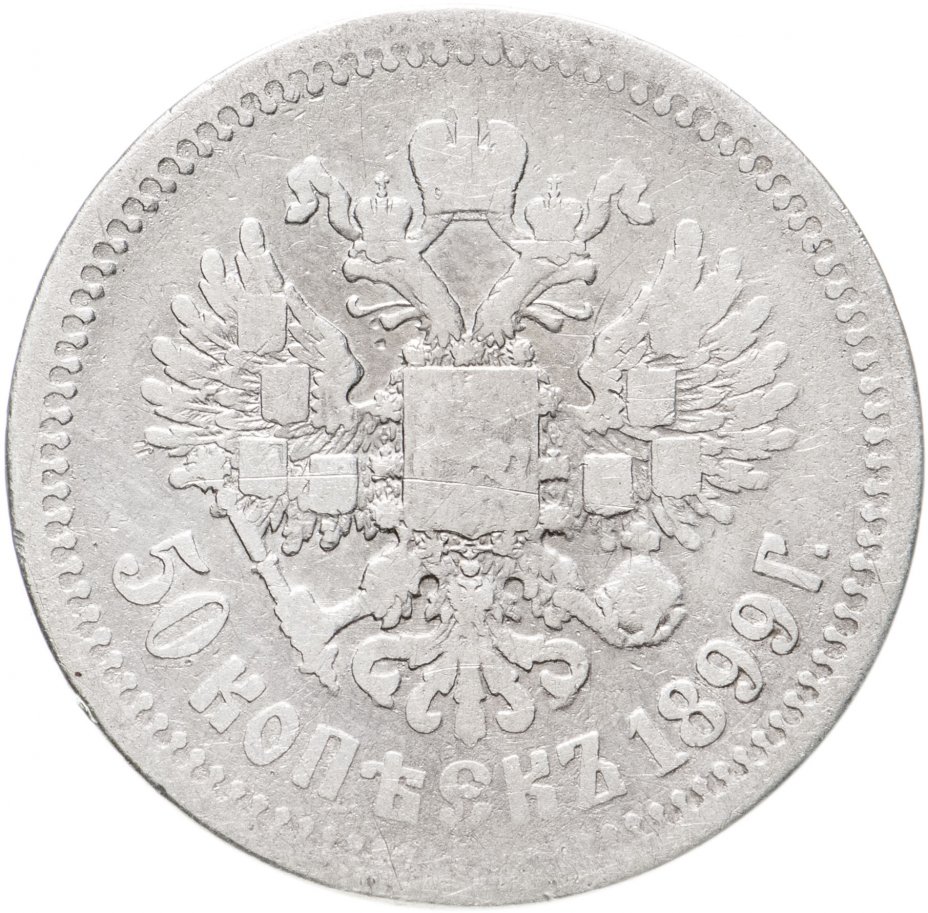Серебряный полтинник Николая II с датой «1899» и знаки минцмейстеров на его гурте