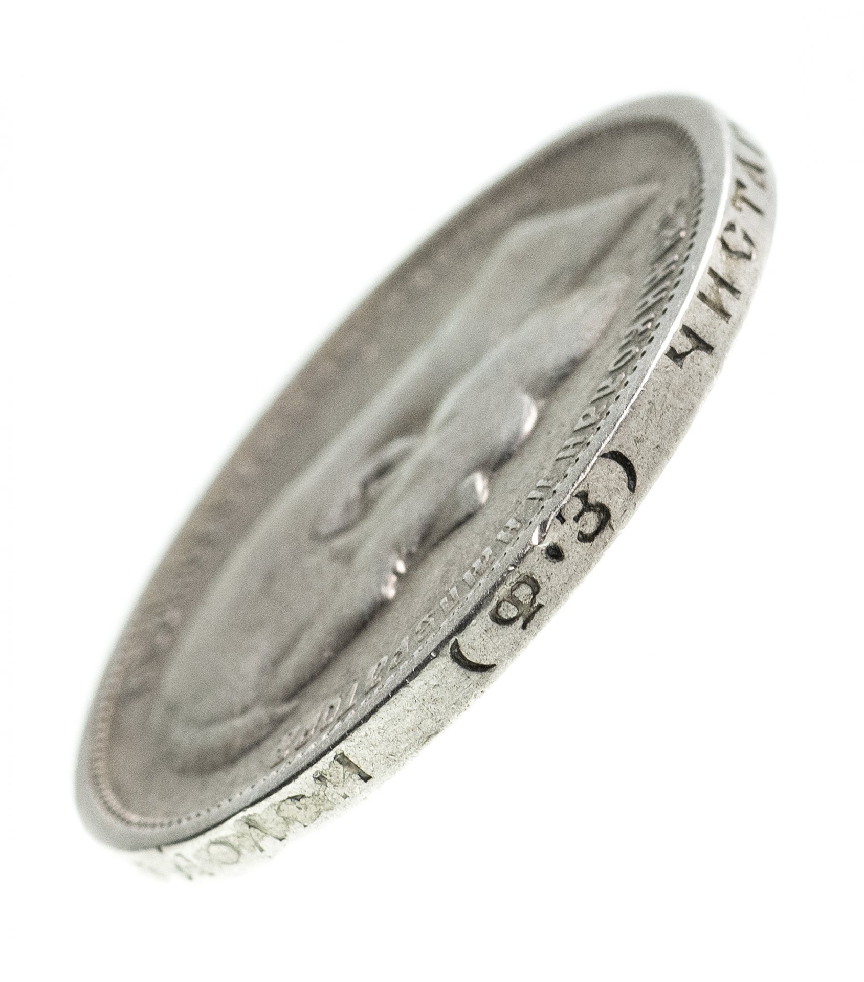 В центре профильный портрет влево императора Николая II. Слева надпись «Б.М. НИКОЛАЙ II ИМПЕРАТОР», справа - «И САМОДЕРЖЕЦ ВСЕРОСС.». По окружности канта имеются рельефные элементы, выполненные в виде зубцов.
