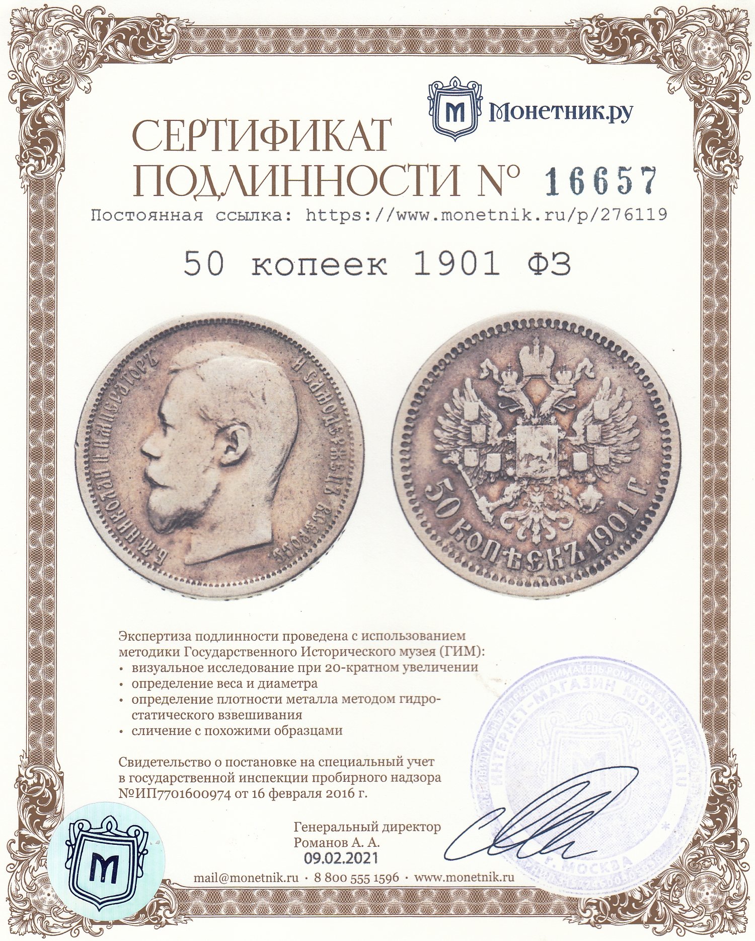 • Сертификат подлинности: № 16657