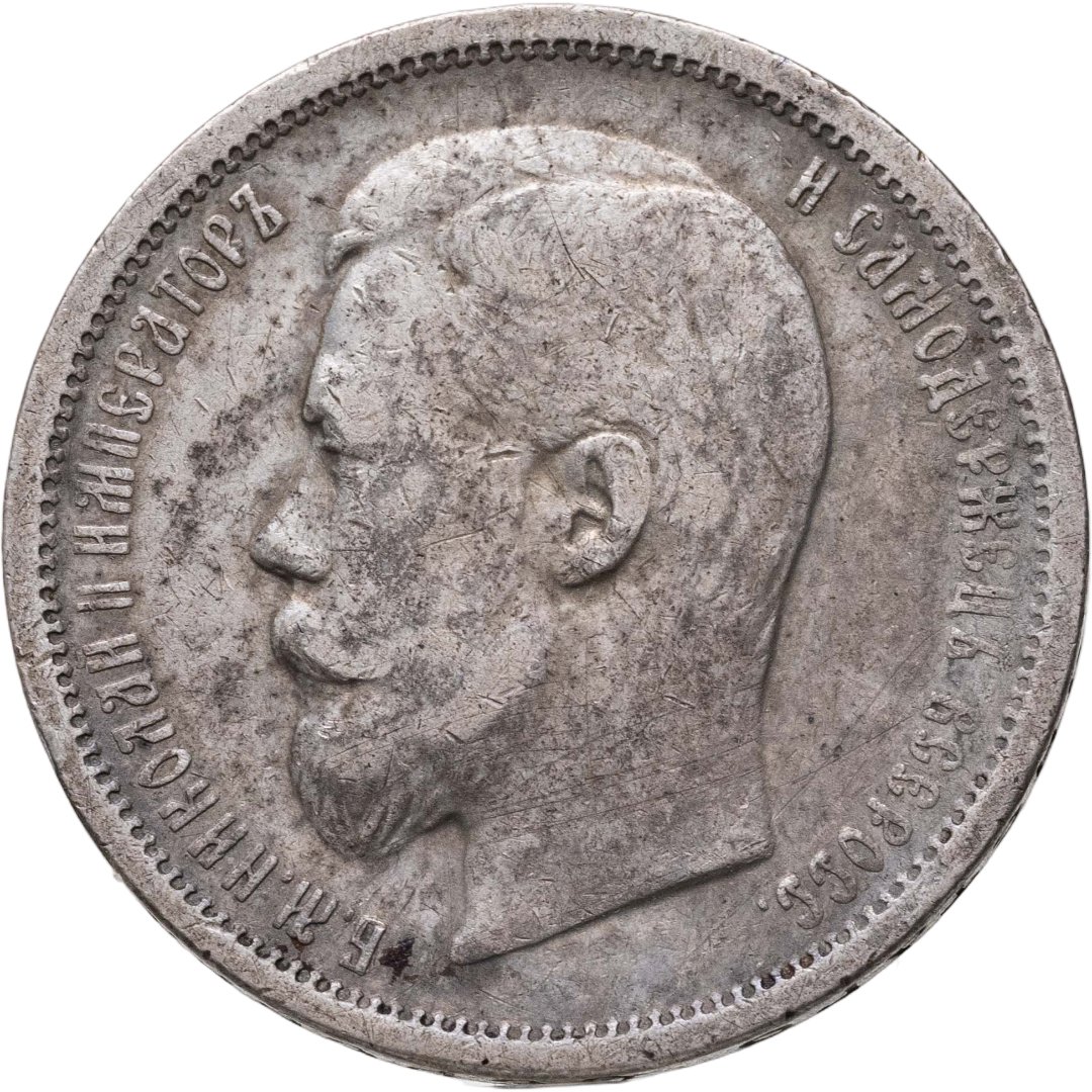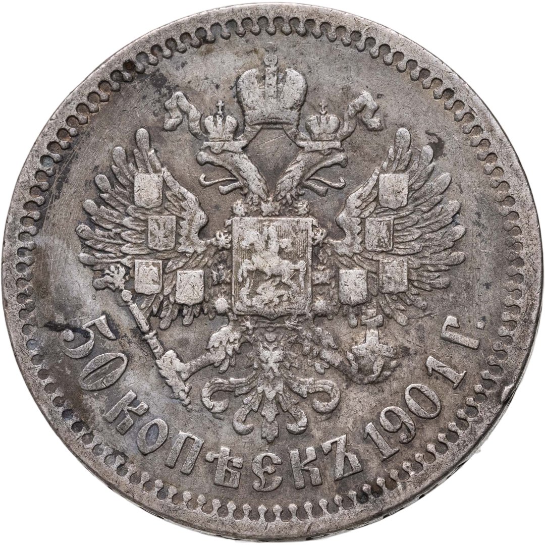 В центре изображен Малый Государственный Герб Российской империи - двуглавый орёл, головы которого увенчаны двумя коронами, третья, большая корона над ними. Все они соединены орденской лентой ордена Св. Апостола Андрея Первозванного. На груди орла расположен Московский герб, в щите изображен Георгий Победоносец с копьем поражающий дракона. Вокруг щита цепь ордена Св. Апостола Андрея Первозванного. На крыльях изображены гербы: Царства Казанского, Польского, Херсонеса Таврического, Астраханского, Сибирского, Грузинского и герб соединенных княжеств Киевского, Новгородского и Владимирского — по 4 на каждое крыло. В правой лапе орла – скипетр, в левой – держава. Под ним слева направо изображены: номинал - надпись «50 копеек» и дата выпуска «1901 Г.». По окружности канта имеются рельефные элементы, выполненные в виде зубцов.