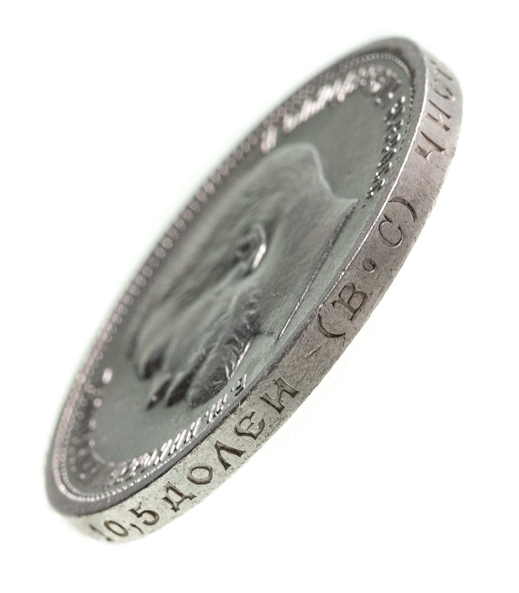 В центре профильный портрет влево императора Николая II. Слева надпись «Б.М. НИКОЛАЙ II ИМПЕРАТОР», справа - «И САМОДЕРЖЕЦ ВСЕРОСС.». По окружности канта имеются рельефные элементы, выполненные в виде зубцов.