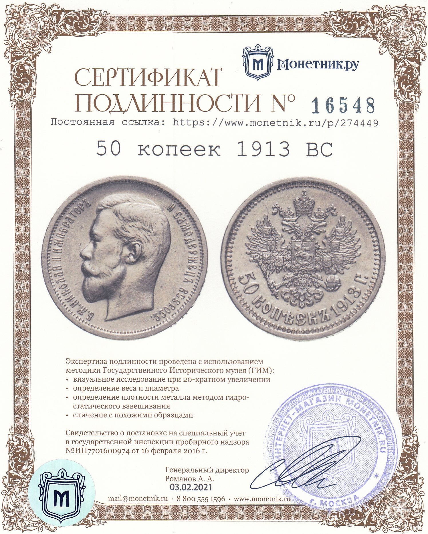 • Сертификат подлинности: № 16548
