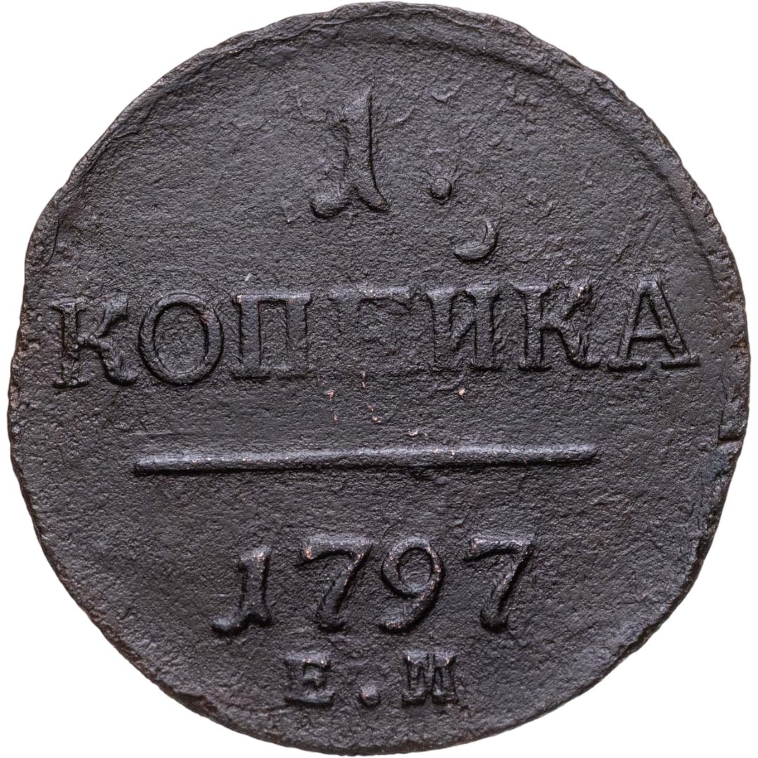 В центре надпись — слово «КОПЕЙКА». Над надписью — цифра «1.». Под надписью — прямая черта, под ней — дата выпуска монеты «1797». Под датой обозначение Екатеринбургского монетного двора — буквы «Е.М.».