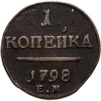 В центре надпись — слово «КОПЕЙКА». Над надписью — цифра «1.». Под надписью — прямая черта, под ней — дата выпуска монеты «1798». Под датой обозначение Екатеринбургского монетного двора — буквы «Е.М.».