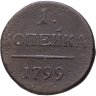 В центре надпись — слово «КОПЕЙКА». Над надписью — цифра «1.». Под надписью — прямая черта, под ней — дата выпуска монеты «1799». Под датой обозначение Екатеринбургского монетного двора — буквы «Е.М.».