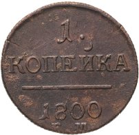 В центре надпись — слово «КОПЕЙКА». Над надписью — цифра «1.». Под надписью — прямая черта, под ней — дата выпуска монеты «1800». Под датой обозначение Екатеринбургского монетного двора — буквы «Е.М.».