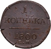 В центре надпись — слово «КОПЕЙКА». Над надписью — цифра «1.». Под надписью — прямая черта, под ней — дата выпуска монеты «1800». Под датой обозначение Екатеринбургского монетного двора — буквы «Е.М.».