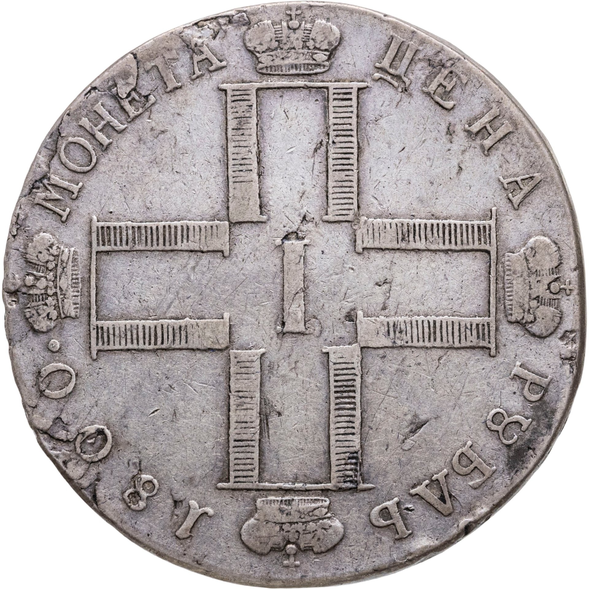 В центре изображена крестообразная монограмма, состоящая из 4 букв «П», увенчанных императорскими коронами и римской цифры «I» в центре. Вдоль канта круговая надпись: «МОНЕТА ЦЕНА РУБЛЬ 1800.», разделённая на 4 части императорскими коронами.