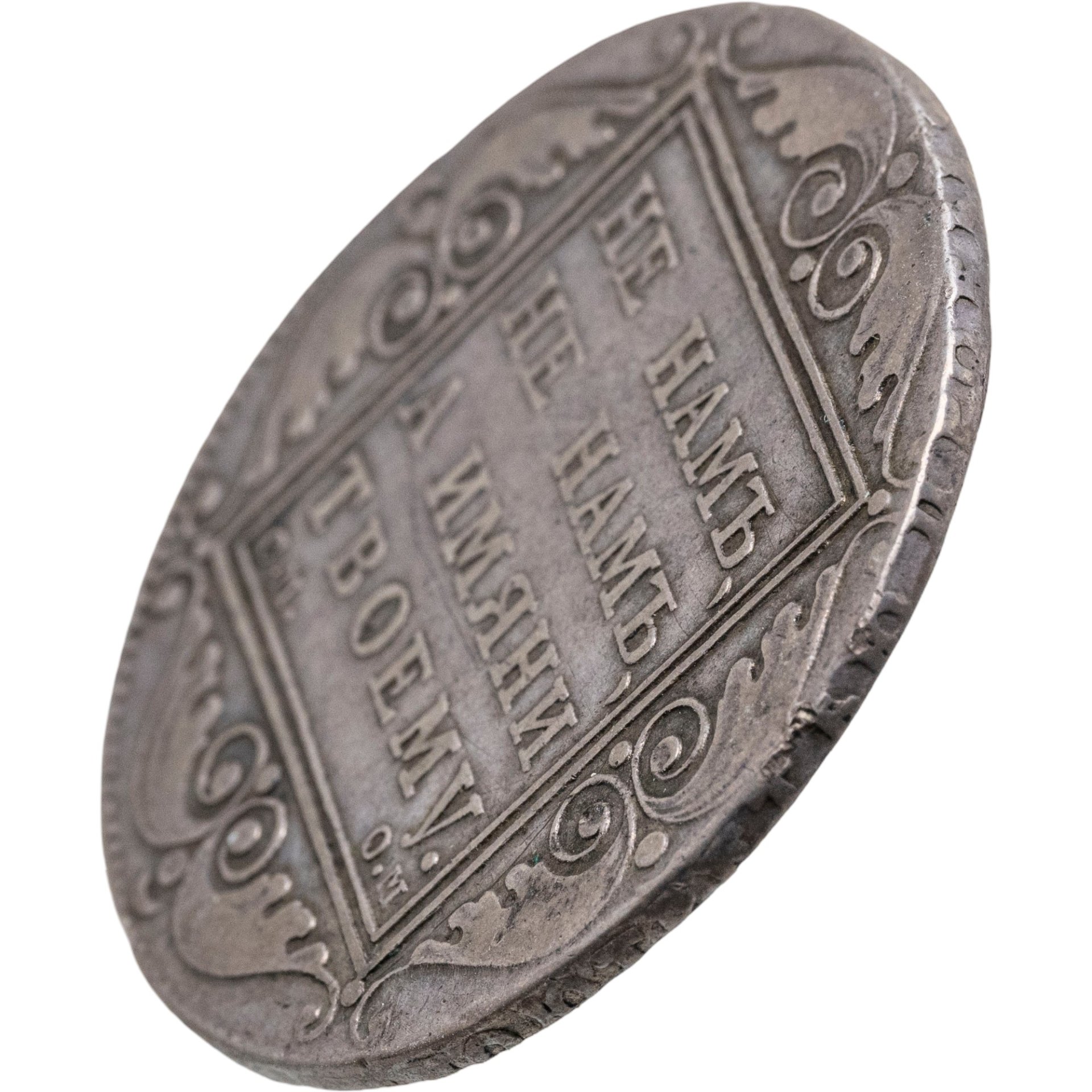 В центре изображен картуш с надписью в четыре строки: «НЕ НАМЪ»│«НЕ НАМЪ»│«А ИМЯНИ»│«ТВОЕМУ.». Под надписью буквы: слева - "С.М.", обозначение Санкт-Петербургского монетного двора, справа - "О.М", инициалы минцмейстера Осипа Мейджера.