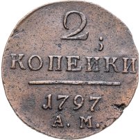 В центре надпись — слово «КОПЕЙКИ». Над надписью — цифра «2.». Под надписью — прямая черта, под ней — дата выпуска монеты «1797». Под датой обозначение Аннинского монетного двора — буквы «А.М.».