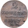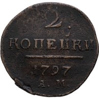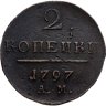 В центре надпись — слово «КОПЕЙКИ». Над надписью — цифра «2.». Под надписью — прямая черта, под ней — дата выпуска монеты «1797». Под датой обозначение Аннинского монетного двора — буквы «А.М.».
