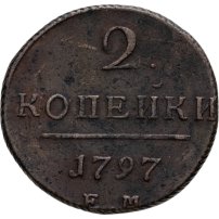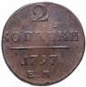 В центре надпись — слово «КОПЕЙКИ». Над надписью — цифра «2.». Под надписью — прямая черта, под ней — дата выпуска монеты «1797». Под датой обозначение Екатеринбургского монетного двора — буквы «Е.М.».