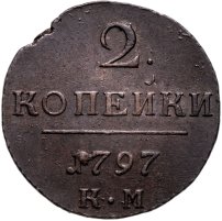 В центре надпись — слово «КОПЕЙКИ». Над надписью — цифра «2.». Под надписью — прямая черта, под ней — дата выпуска монеты «1797». Под датой обозначение Сузунского монетного двора — буквы «К.М».