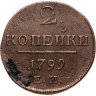 В центре надпись — слово «КОПЕЙКИ». Над надписью — цифра «2.». Под надписью — прямая черта, под ней — дата выпуска монеты «1799». Под датой обозначение Екатеринбургского монетного двора — буквы «Е.М.».