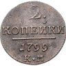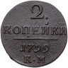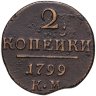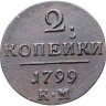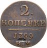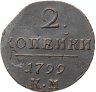 В центре надпись — слово «КОПЕЙКИ». Над надписью — цифра «2.». Под надписью — прямая черта, под ней — дата выпуска монеты «1799». Под датой обозначение Сузунского монетного двора — буквы «К.М».